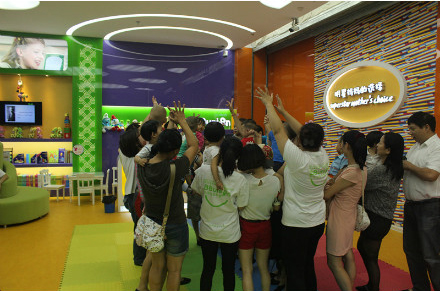 除了欢快的律动操之外,BBunion外图店还准备了好玩的亲子游戏??诺亚方舟搬搬乐。瞧,家长们都在抱着宝宝奋力向前,现场充满了此起彼伏的加油声。